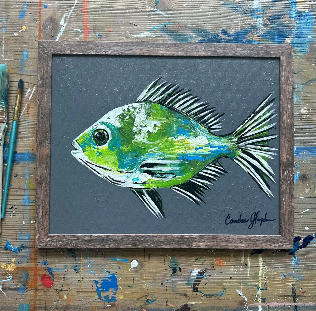 “Wasabi” 11×14 original textured acrylic painting with green and blue hues. Iron Gray textured background. Great to add to a wall space with other small wall art pieces. Rustic wooden frame, ready to hang.